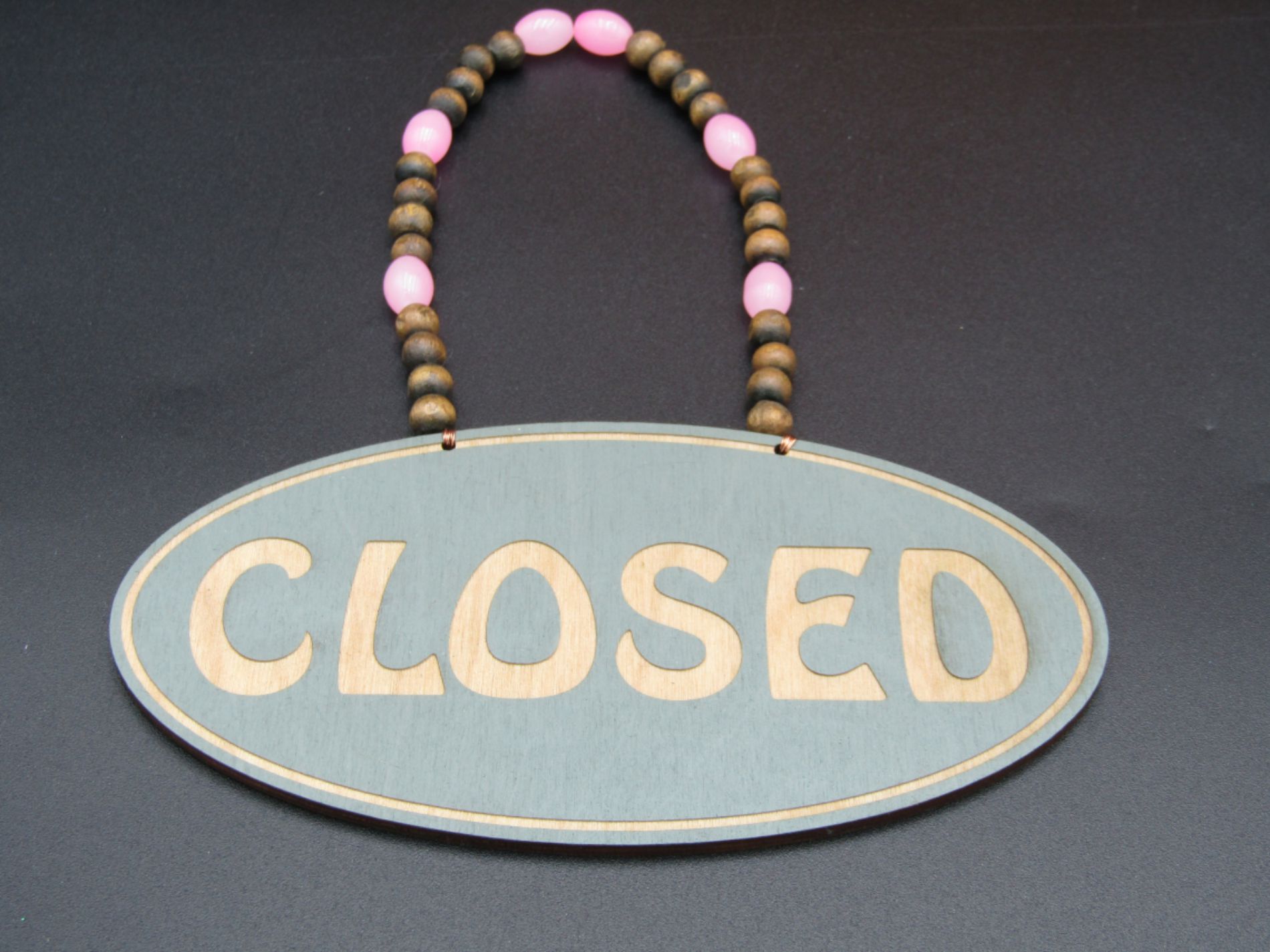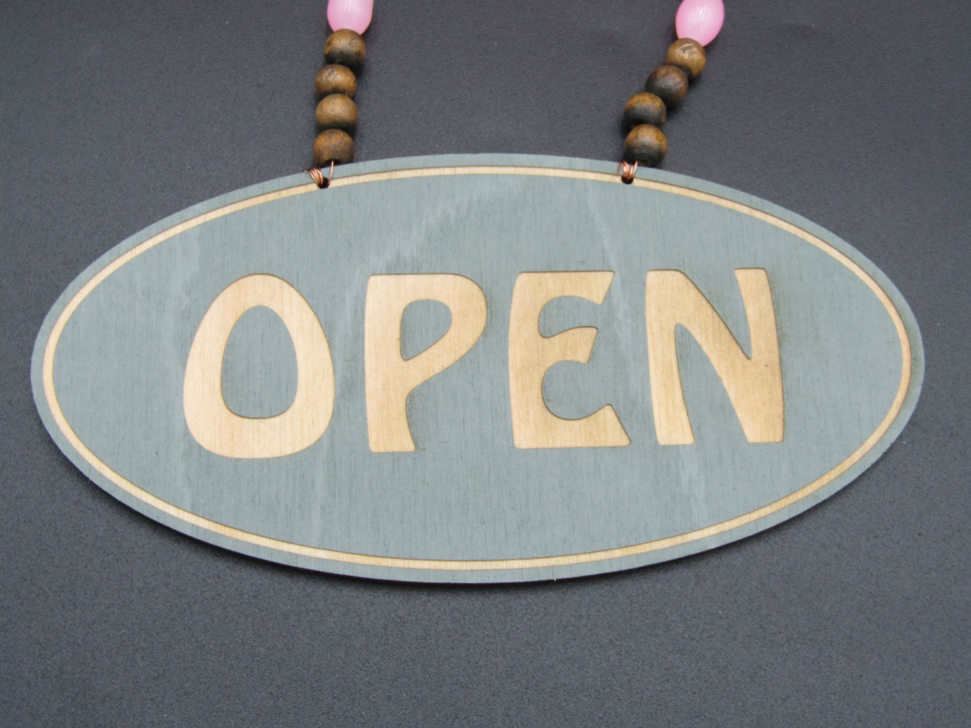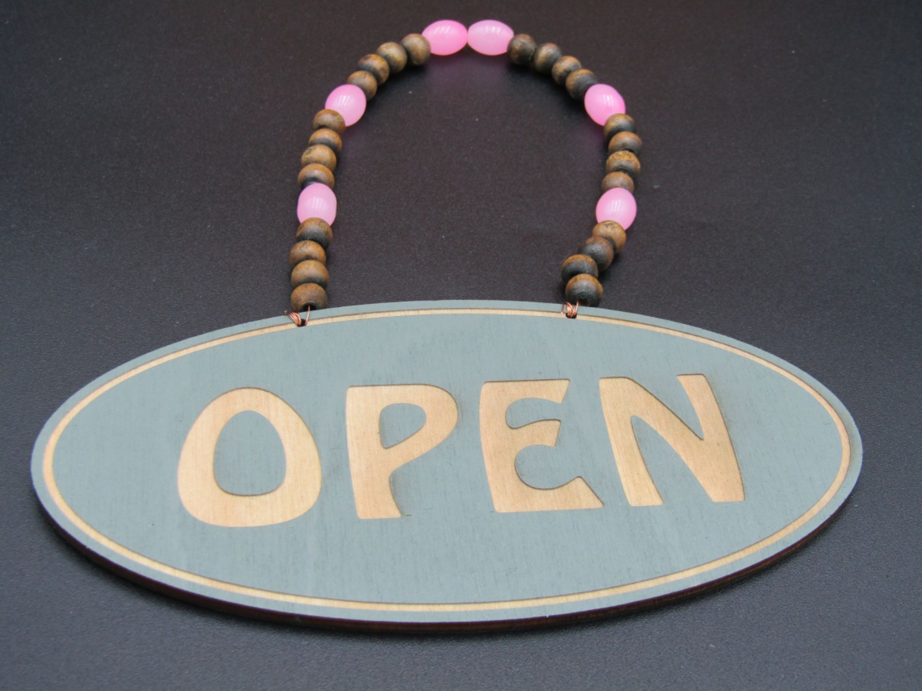 Add a touch of colour and originality to your shop window with this beaded open-closed shop sign, laser engraved and hung with copper wiring and a complimentary colourful mix of beads. The sign has been given a calming Sage finish, oval in shape with a single contour line around the edge of the sign and beaded with a mix of pink acrylic and wooden beads.