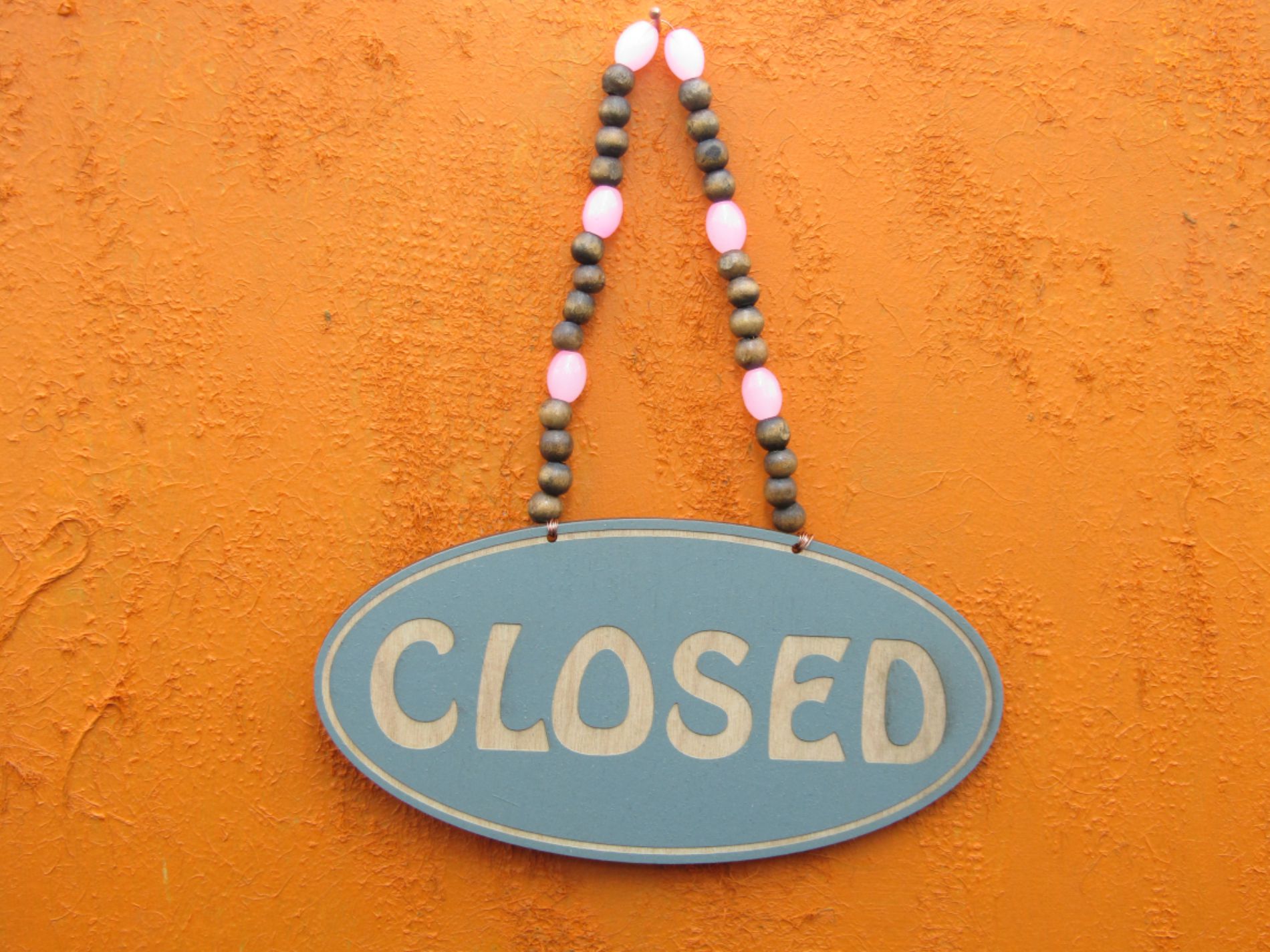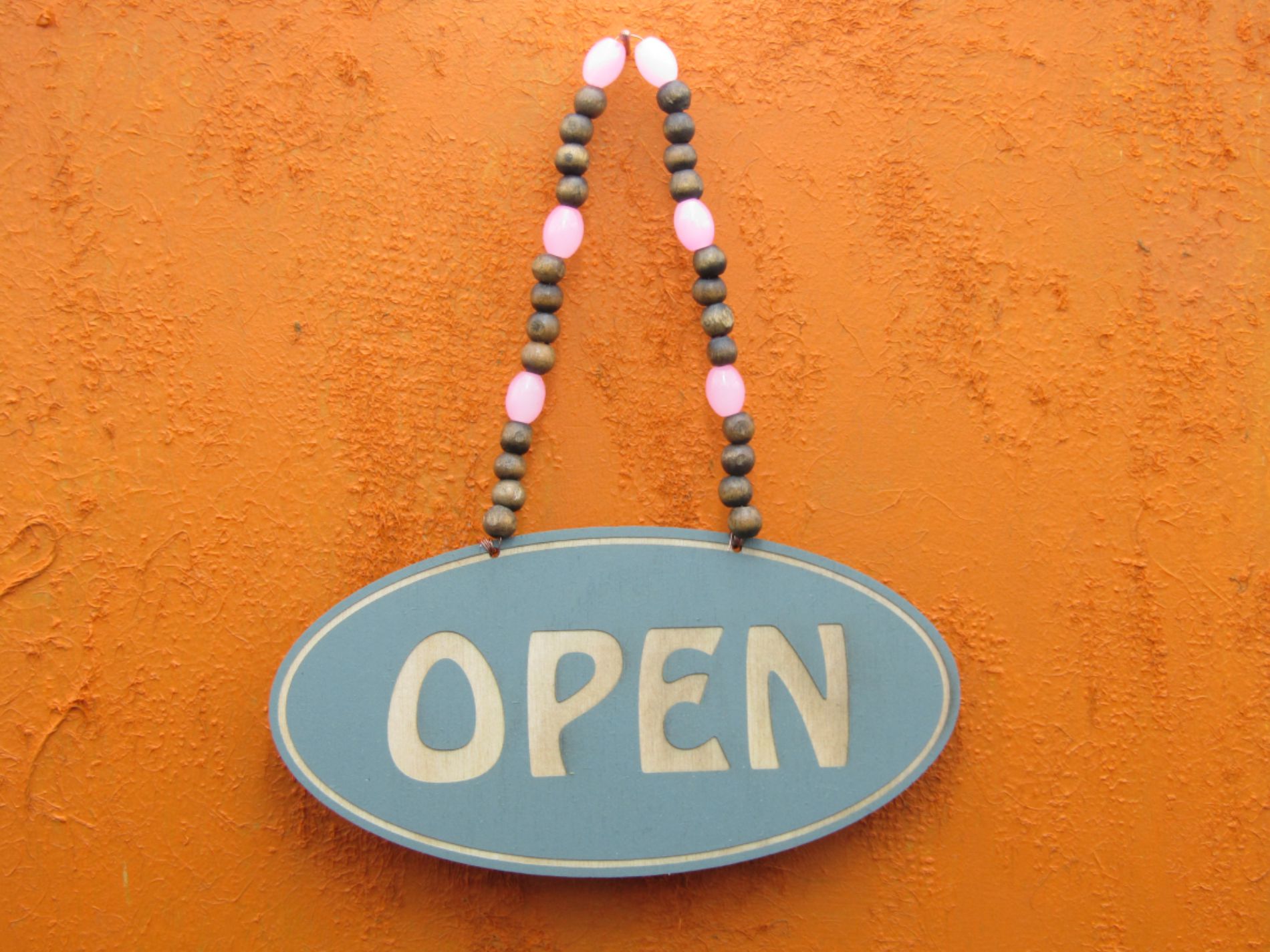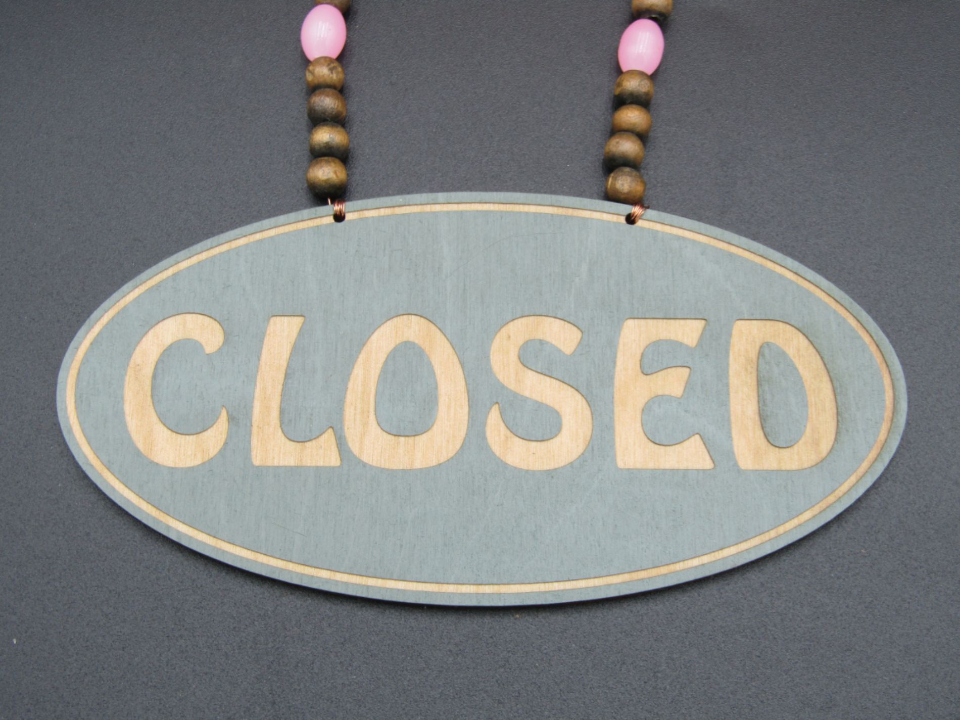 Add a touch of colour and originality to your shop window with this beaded open-closed shop sign, laser engraved and hung with copper wiring and a complimentary colourful mix of beads. The sign has been given a calming Sage finish, oval in shape with a single contour line around the edge of the sign and beaded with a mix of pink acrylic and wooden beads.