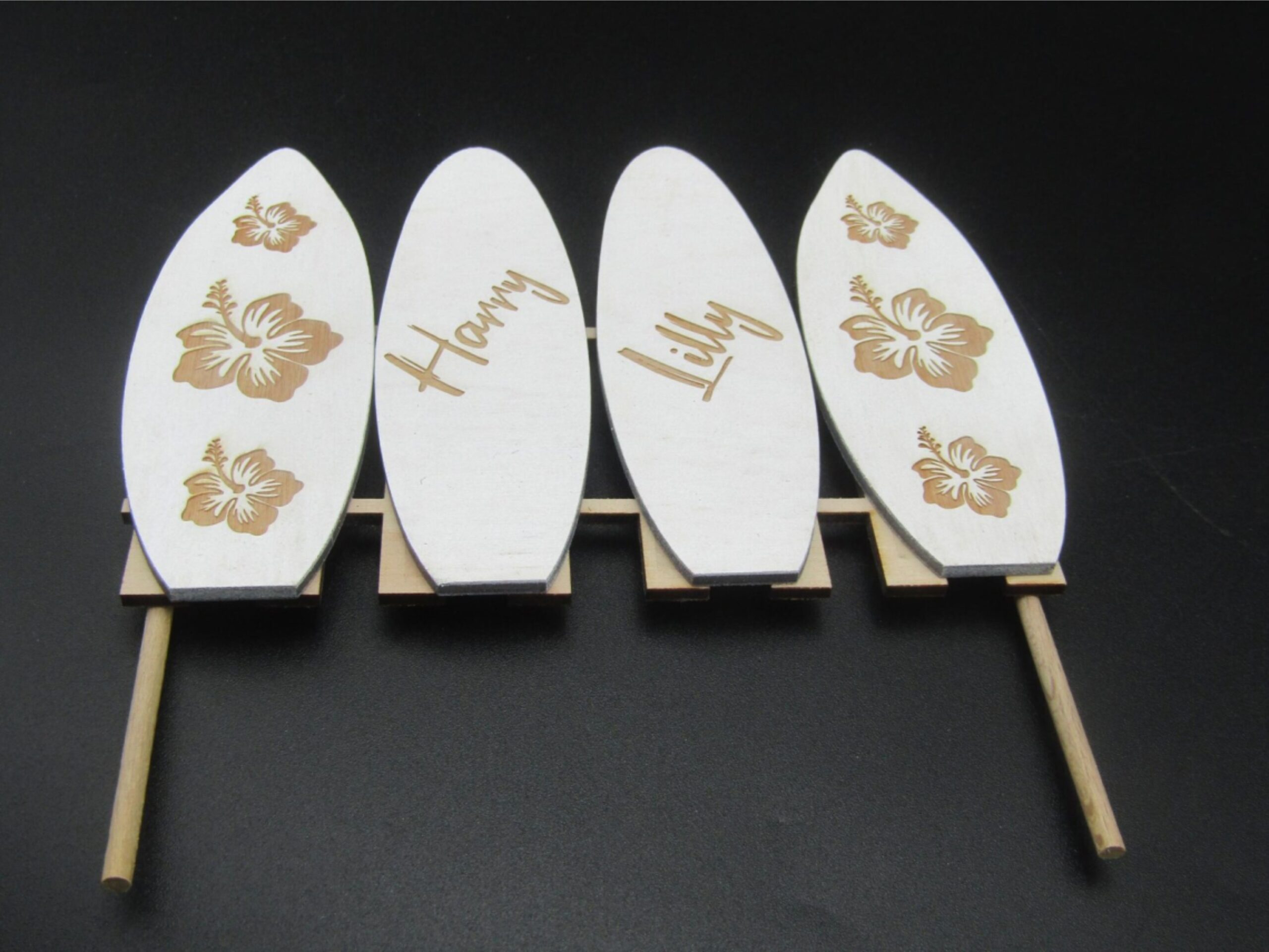 This surfboard-themed wedding cake topper is perfect for beach lovers, surfers, and couples who feel most at home by the sea. Featuring four surfboards standing together, the middle two are personalised with the happy couples names, symbolising togetherness, adventure, and riding every wave of life side by side, making this a great topper not just for weddings but anniversaries and engagements also.